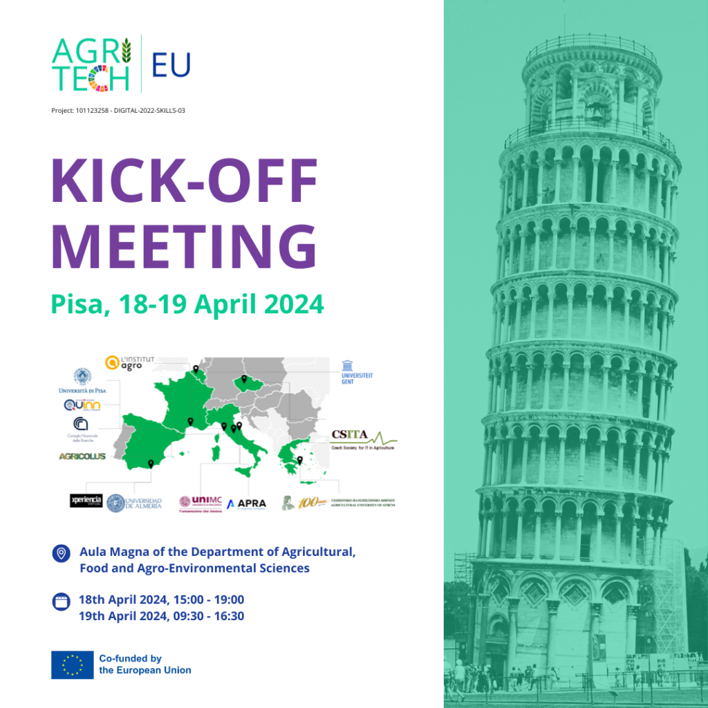 AGRITECH EU (Digital agriculture for sustainable development) is a Digital Europe Project coordinated by the University of Pisa. It aims to devise learning modules aimed at developing high-level skills in the area of digitalization for sustainable agriculture, with an emphasis on the principles of agroecology and responsible innovation.